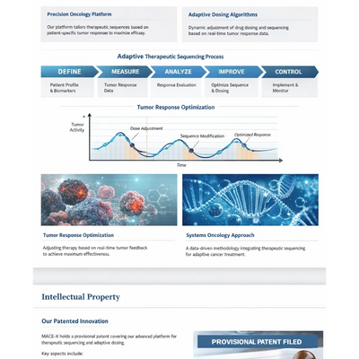 MACE-X is developing a precision oncology platform utilizing therapeutic sequencing and adaptive dosing algorithms based on tumor response optimization. The platform applies Six Sigma DMAIC methodology to treatment timing architecture, enabling response-guided therapeutic control within a systems oncology framework. This platform-based approach allows multiple therapeutics to be sequenced and optimized dynamically to improve treatment efficiency and precision.